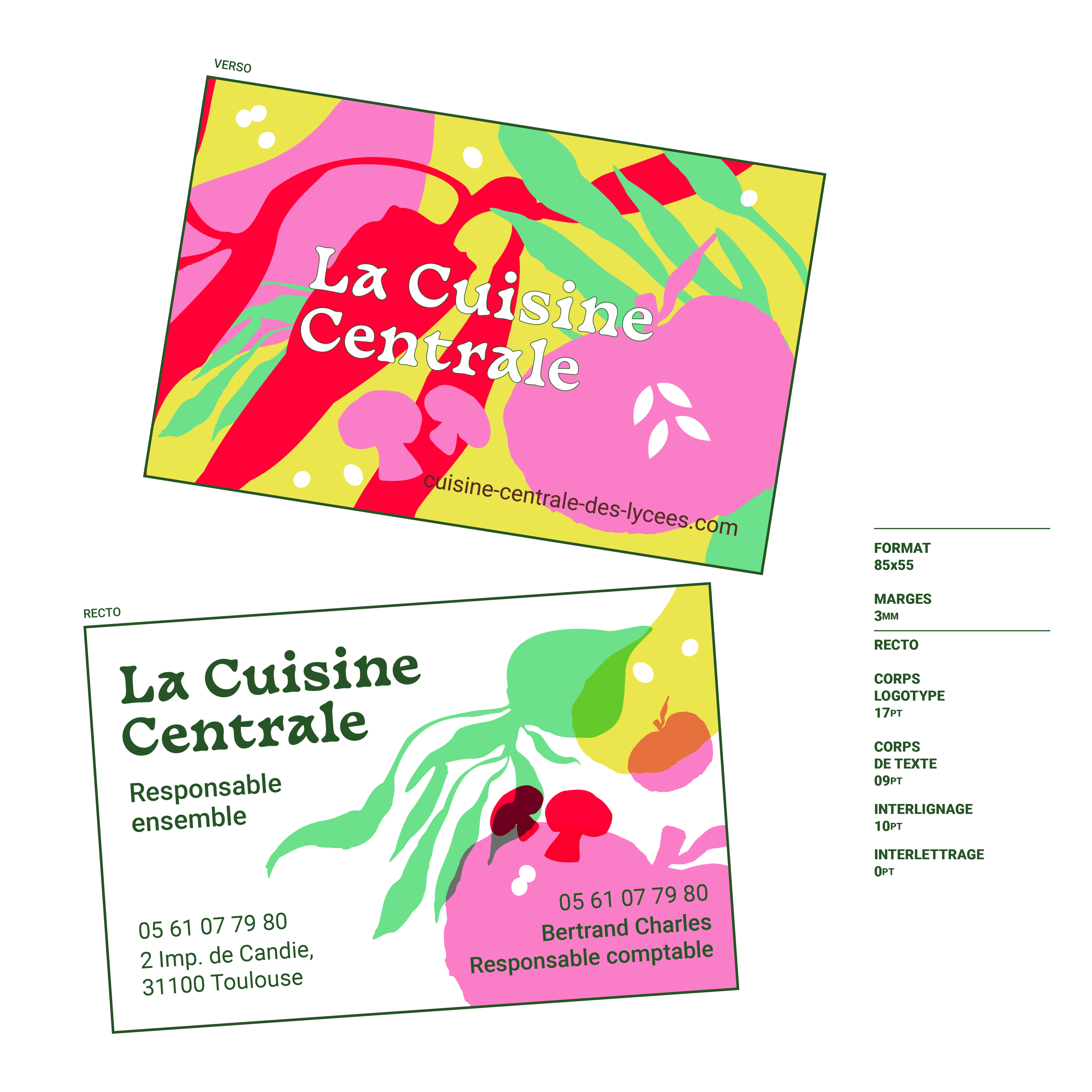 Conception d'une nouvelle identité visuelle pour la Cuisine Centrale des collèges et lycées de Toulouse, mettant en avant des produits qualitatifs et locaux, aux traits irréguliers car travaillés à la main.