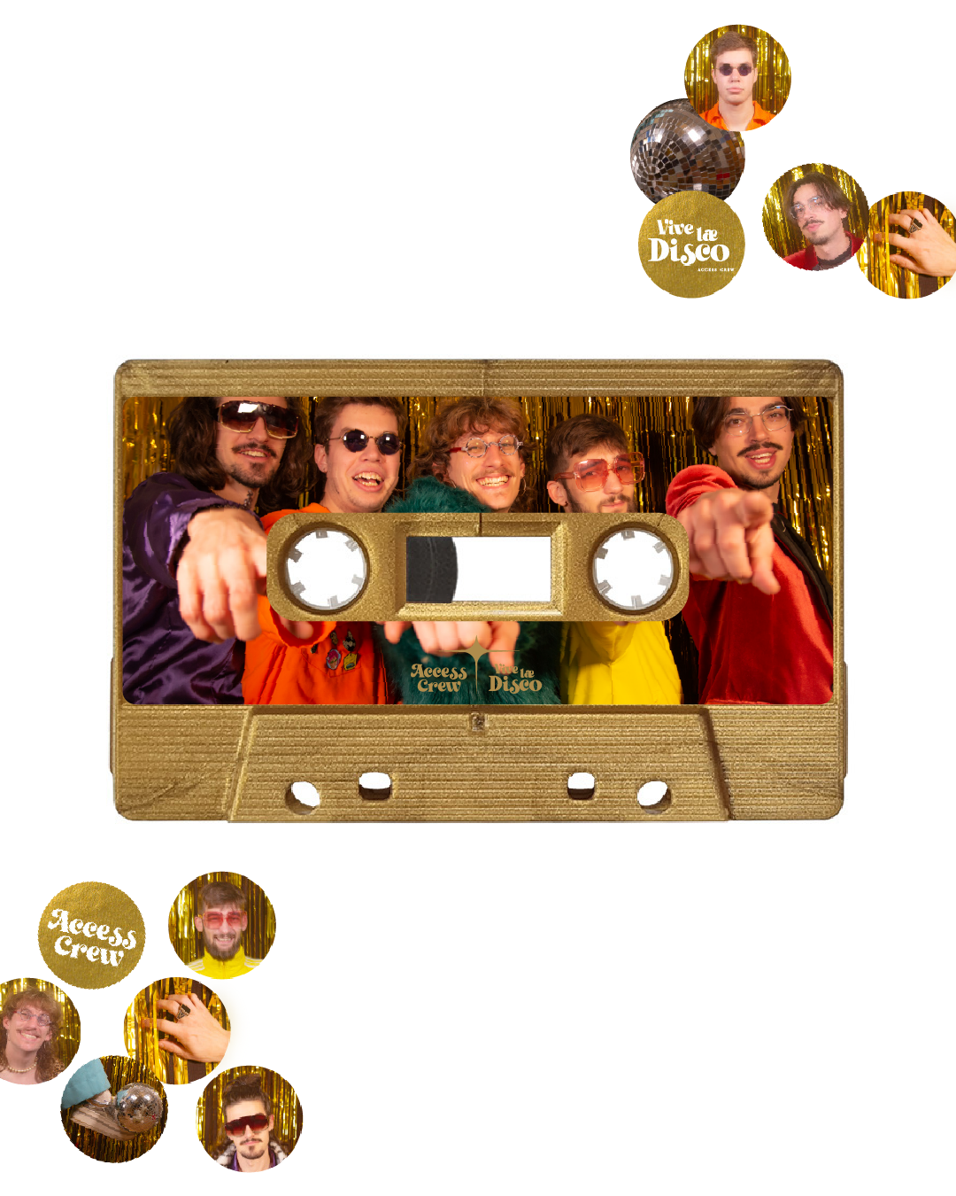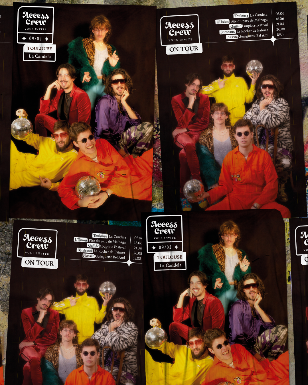 Création des couvertures de singles et d'album pour le projet Vive Lae Disco du groupe Toulousains de Disco et Funk : Access Crew. Les photographies et les déclinaisons graphiques souhaitent mettrent en avant la qualité du projet musical d'Access Crew et d'ainsi mettre l'emphase sur le travail de création des personnages et de leurs identités propres qui a été fait par le groupe. La musique étant elle même un hommage au disco, l'esthétique choisie est en écho direct avec des groupes phares de ce mouvement musical.