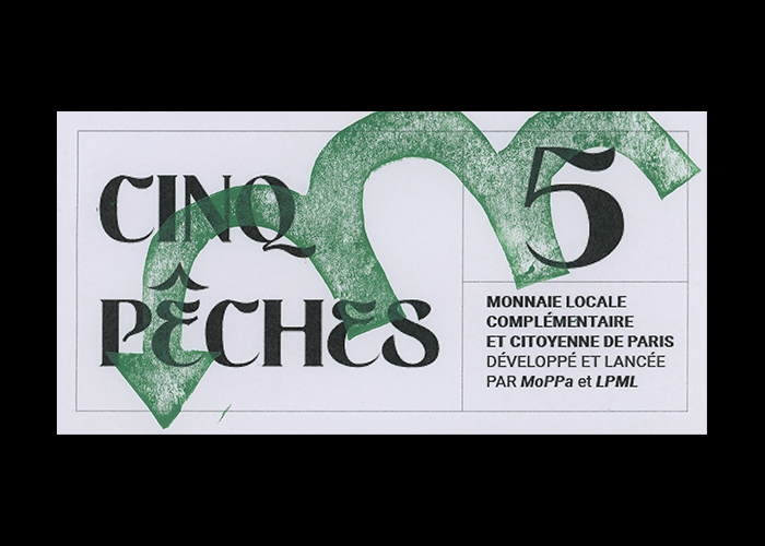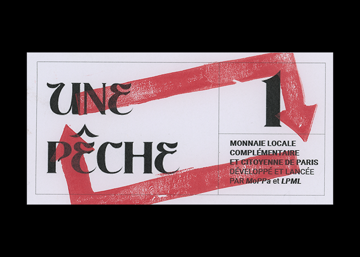 Refonte de l’identité de la monnaie locale de Paris : la Pêche. J’ai souhaité redonner une dimension plus humaine au paiement en utilisant des signes graphiques symbolisant l’échange. La linogravure permet d’explorer les notions de lisibilité et illisibilité de la lettre, pour créer un contraste entre la monnaie fiduciaire (que l’on voit) et électronique (que l’on ne voit pas).
