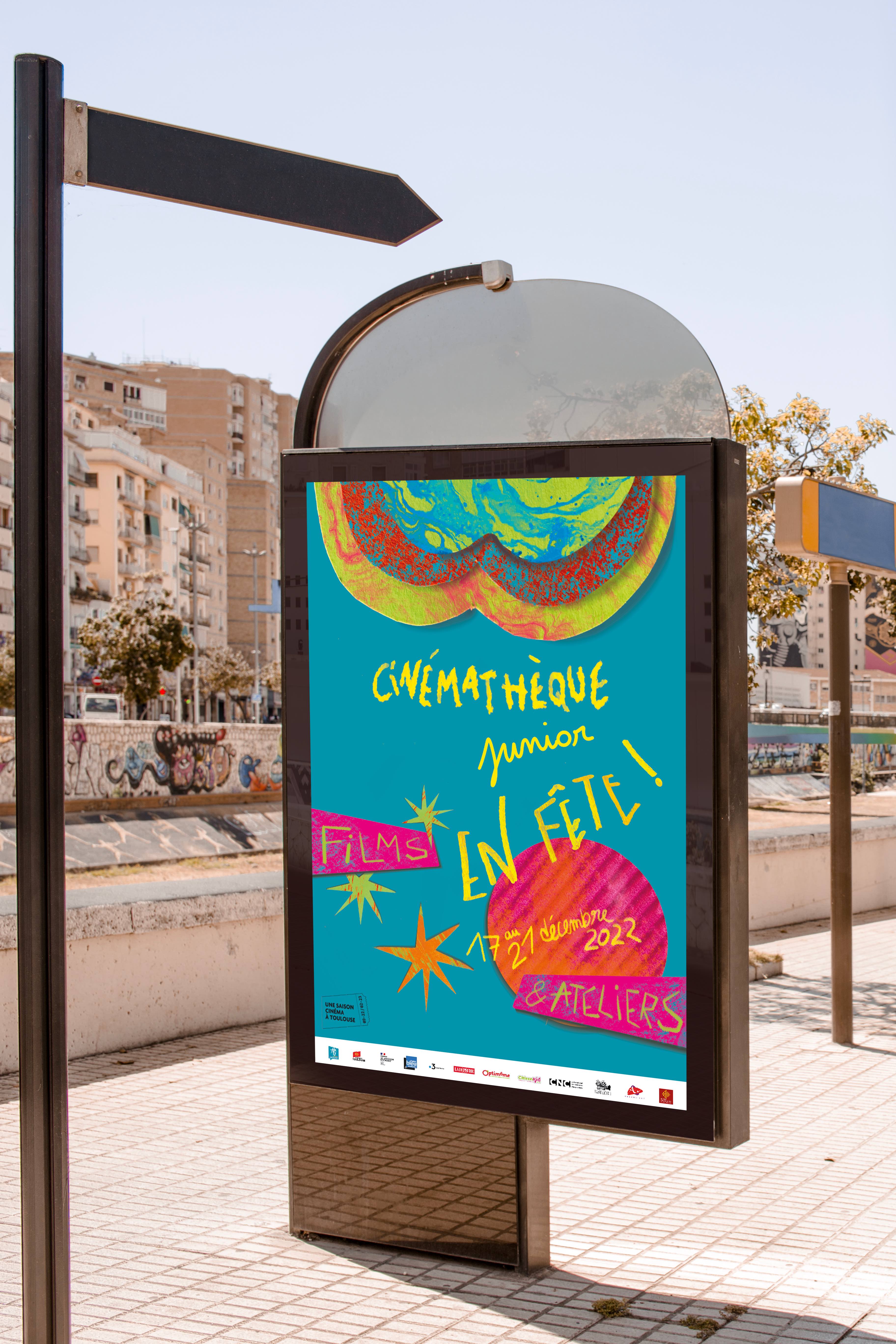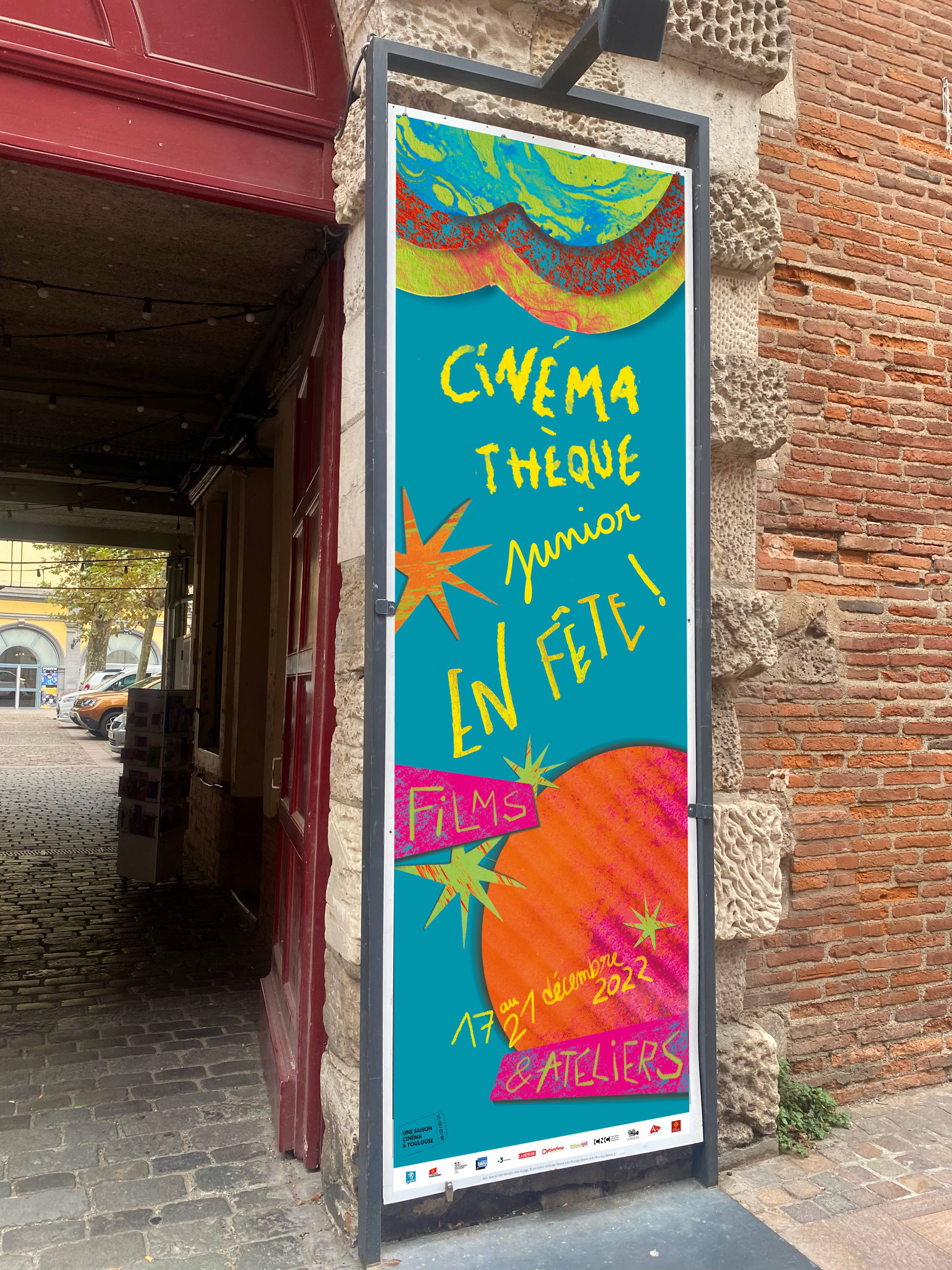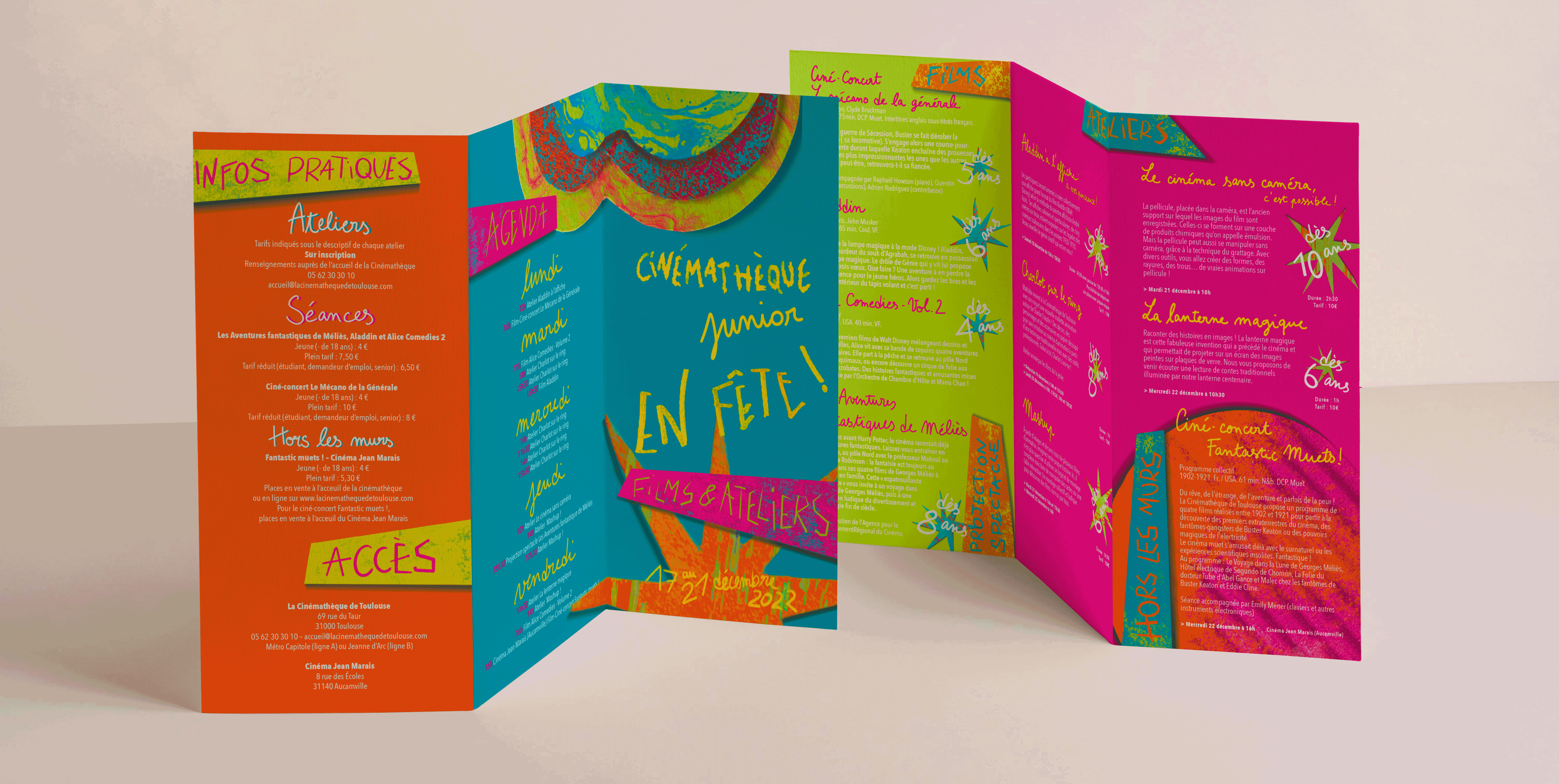 Création d’une identité visuelle, pour un évènement toulousain jeune public proposant une offre d’ateliers créatifs et d’initiation au cinéma. Les commanditaires nous ont demandé l’élaboration d’une affiche et d’un dépliant coloré et festif pouvant attiré les enfants. Mon parti-pris a été de travailler avec des formes simples en papier découpées et de créer des textures avec divers outils pour rappeler le côté « Atelier » proposé lors de cet évènement. C’est une invitation visuelle à un moment de partage et de création dans une atmosphère de fête et de bonne humeur.