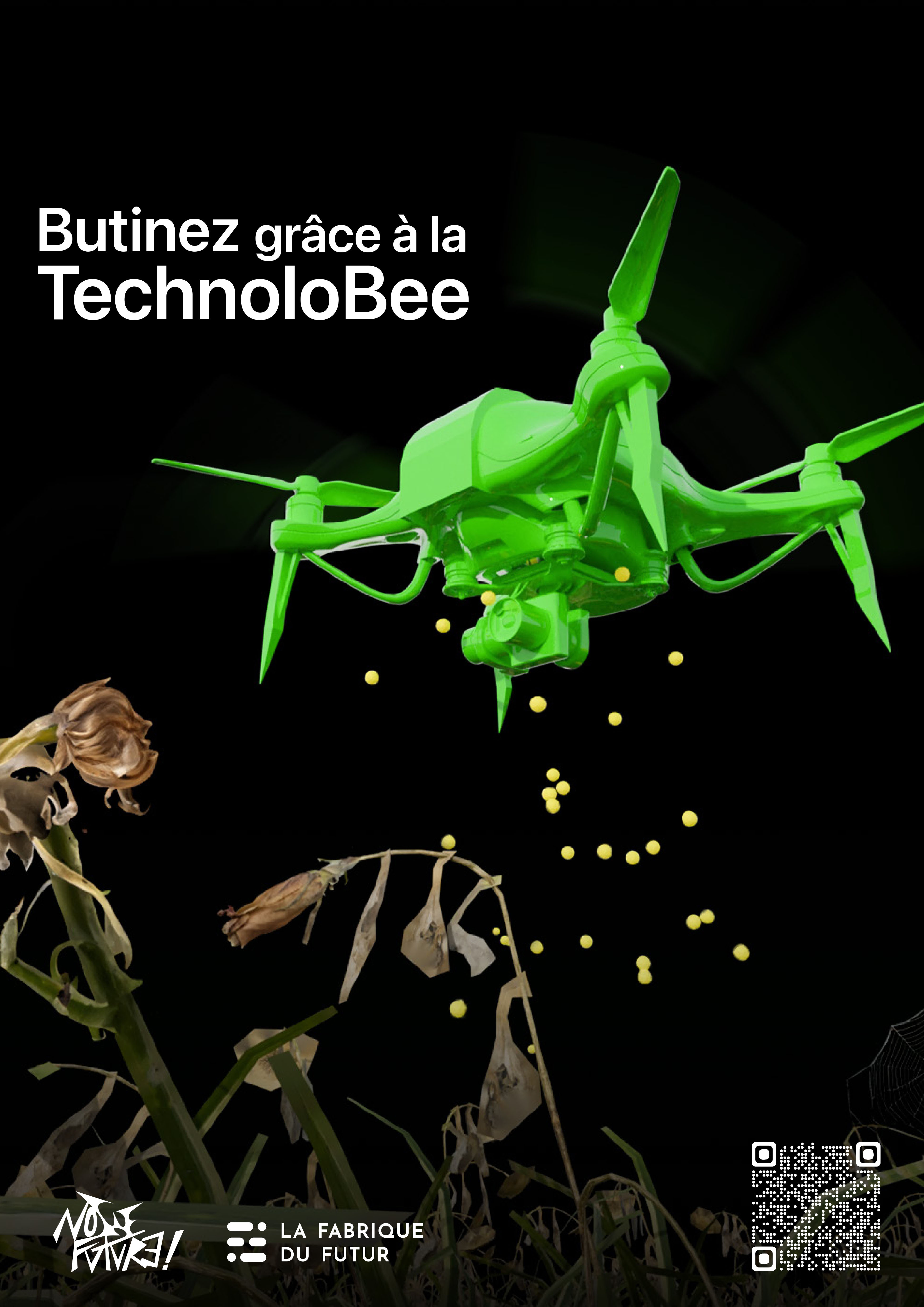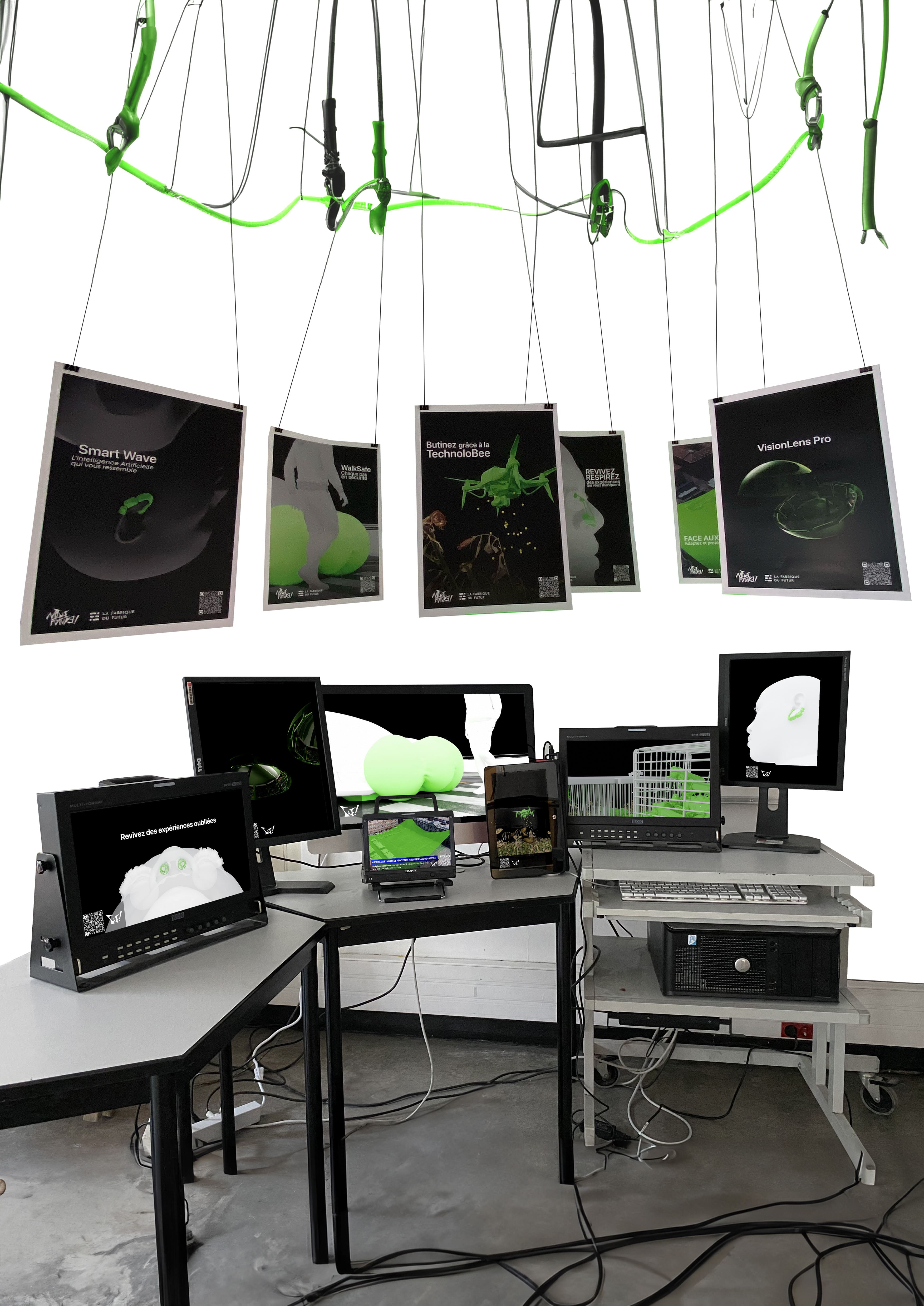 The project is divided into 7 different posters, each dealing with a future technological issue. Based on advertising, each poster presents a fictitious product that could emerge in the near future, the aim being to provoke thought from the public who, if they wish, can scan the QR code to link to an awareness-raising website.
