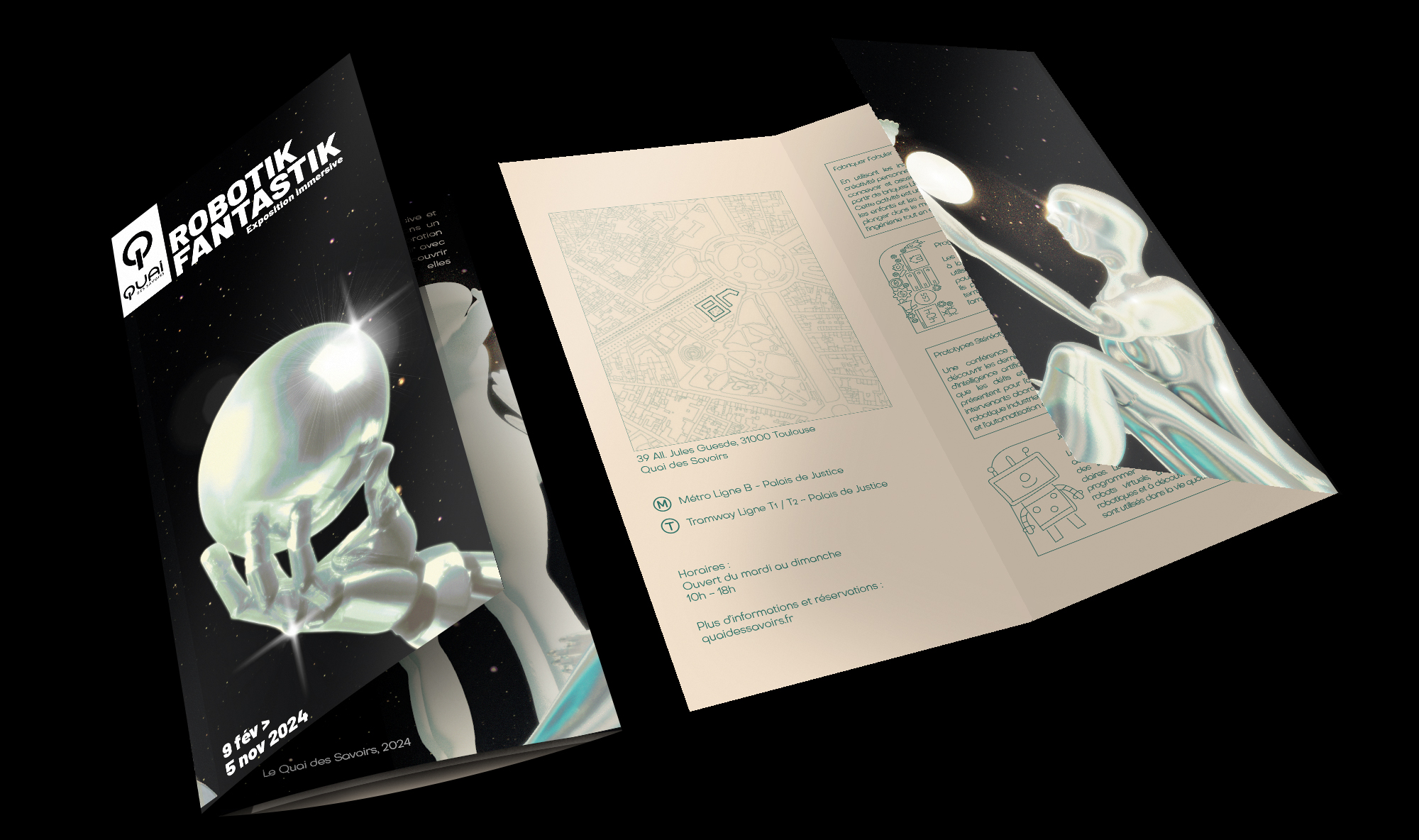 Creation of the visual identity for a fictitious exhibition at the Quai des Savoirs, Museum in Toulouse. The theme of the exhibition would be the future and robotics. For this work, I designed a poster, a flyer and some content for social networks and the website.